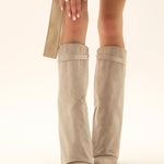 Izrađene od meke brušene kože i vrhunske glatke kože, ove čizme do koljena obavijaju nogu besprijekornim krojem, naglašavajući siluetu s elegancijom i samopouzdanjem.