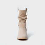 Ženske casual čizme od antilopa, s udobnim fitom i modernim detaljem u sredini. Opušteni dizajn okvira daje boho karakter, dok niska potpetica čini ih idealnima za svakodnevnu upotrebu. Praktični patentni zatvarač sa strane osigurava lako oblačenje i svlačenje.