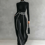 Sofisticirani dvodelni set koji sadrži majicu sa ovratnikom i dugim rukavima sa kontrastnim belim detaljima i široke pantalone. Set uključuje odgovarajući pojas koji naglašava struk, pružajući doteran i usklađen izgled.