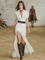 Ova elegantna maksi haljina kombinuje lagani čipkani materijal sa delikatnim plisiranim detaljima i klasičnim reverom. Sa kratkim rukavima, dugmetima na prednjem delu i definisanom strukom, pruža gracioznu siluetu idealnu za formalne i neformalne prilike.