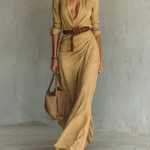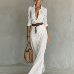 Ženska maksi haljina sa reverom, dugim rukavima i pojasom