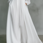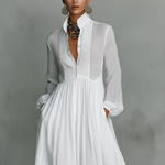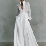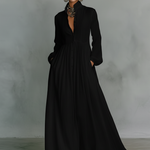 Profinjena minimalistička maxi haljina izrađena od mešavine pamuka i lana, sa patchwork detaljima i stajaćom kragnom sa jednim dugmetom za elegantan, prirodan izgled.