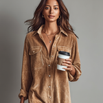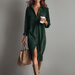 Udobna i moderna midi haljina izrađena od mekog kordura, sa širokim siluetom, duplim džepovima na grudima i klasičnim zatvaranjem na dugmad. Savršena za svakodnevno nošenje sa daškom retro šarma.