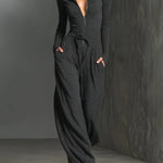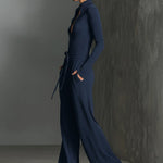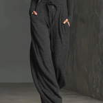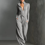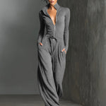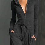 Stilizovani tamno sivi kombinezon sa daškom sjaja, sa patent zatvaračem napred i opuštenim, širokim nogavicama. Napravljen od rastezljivog, lepršavog materijala za šik i udoban izgled.