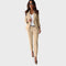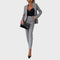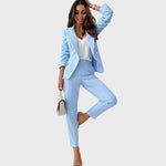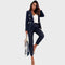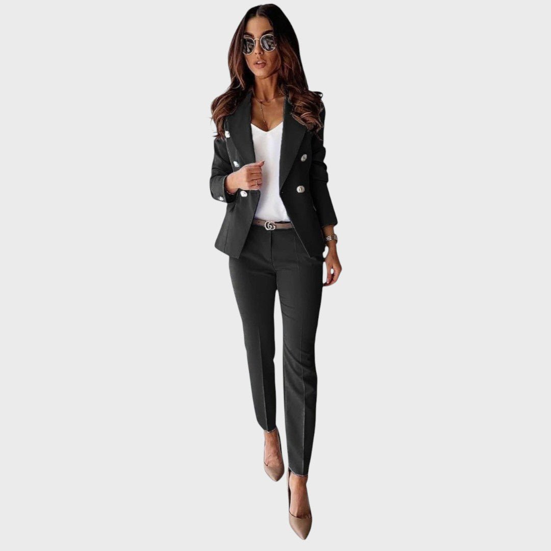 Božena žensko odijelo utjelovljuje klasičnu profinjenost s modernim prizvukom. Dvoredni dizajn sakoa s elegantnim metalnim gumbima i savršeno usklađene hlače stvaraju oštar, strukirani izgled koji odiše samopouzdanjem i elegancijom. Bilo u uredu, na poslovnim sastancima ili na večernjim svečanim događanjima – Božena jamči besprijekornu siluetu i profinjenu prisutnost.