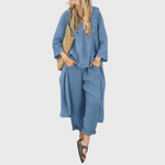 Ovaj komplet od laganog lana savršen je izbor za žene koje vole spoj elegancije i ležernosti. Sastoji se od širokih hlača, udobne bluze i dugog laganog kaputa koji daje profinjenu notu svakodnevnom izgledu. Prozračan materijal pruža lakoću nošenja, a svestran dizajn čini ga idealnim i za grad i za odmor.