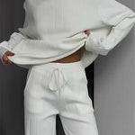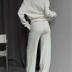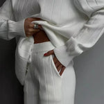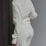 Ovaj elegantni rebrast pleteni komplet kombinira vrhunsku udobnost s modernim, elegantnim izgledom. Savršen je za one koji žele izgledati elegantno bez kompromisa u pogledu udobnosti.