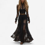 Ova haljina oličava misterioznu eleganciju i tišinu snage u jednoj crnoj čipkastoj kreaciji. Marine™ | Prozračna maxi haljina spaja delikatnost slojeva čipke sa slobodom kroja, otkrivajući suptilne igre svetla i senke. Visok izrez i prozirni rukavi stvaraju siluetu koja teče uz svaki pokret, dok lepršava suknja nosi sa sobom poetsku privlačnost.