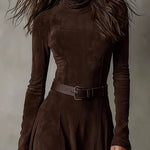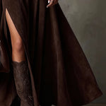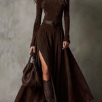 Ova elegantna maksi haljina od tamnobrune umjetne antilope ima upečatljivu prednju prorez i uski kroj, naglašen visokim ovratnikom i dugim rukavima za moderan i sofisticiran izgled.