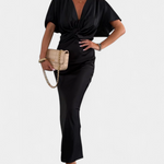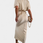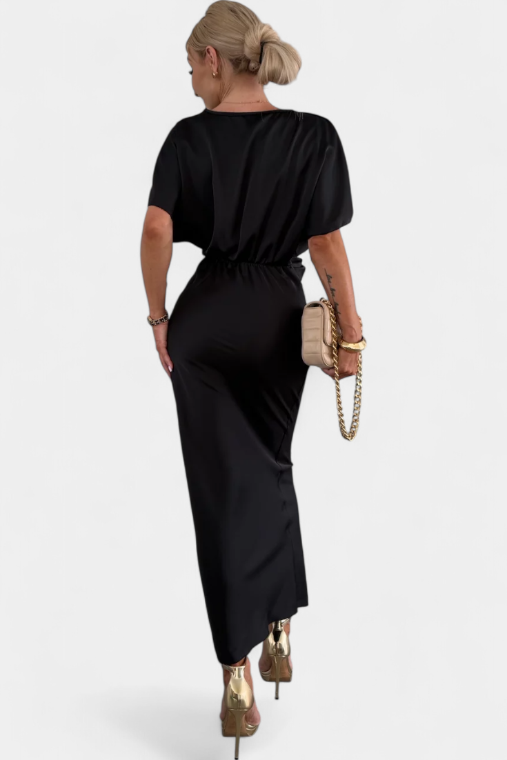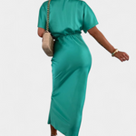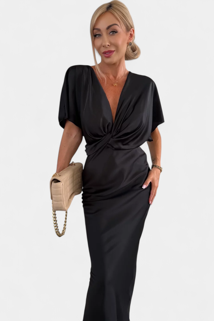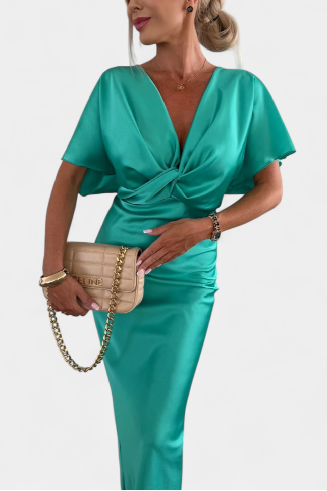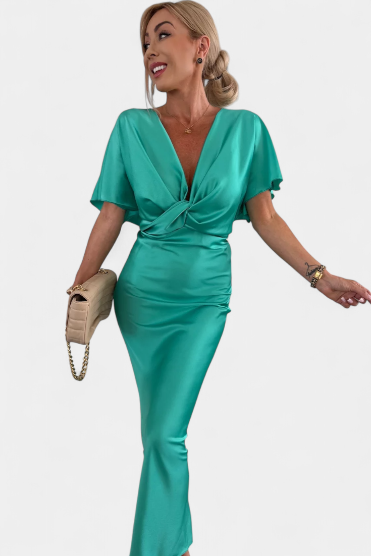 Haljina Nada u jednobojnoj nijansi nudi idealnu ravnotežu između opuštenog stila i elegantnog dizajna. S omotanim V izrezom, prednjim križnim čvorom i kratkim rukavima, ova uska silueta fluidno ističe figuru. Idealna je za neformalne planove kao i za posebne prigode.