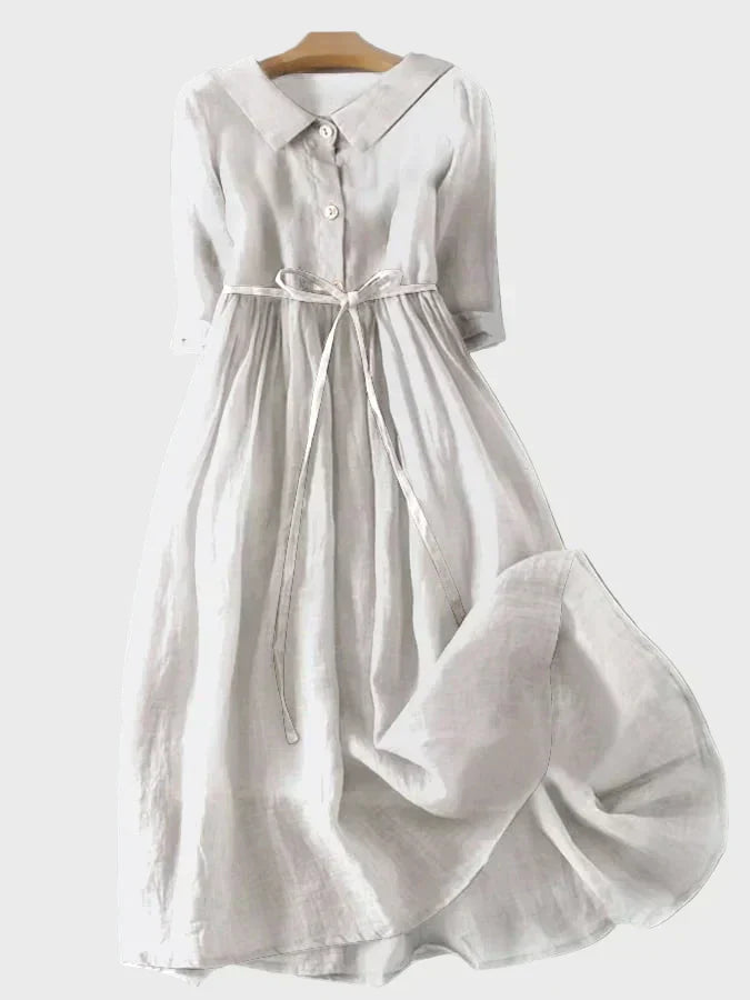 Ova nježna plava haljina isijava mirnoću i eleganciju, idealna za svaku priliku. Njezina jednostavna linija pruža udobnost i bezvremenski stil, dok pojas u struku daje ženstvenu siluetu s prirodnim padom tkanine.