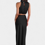 Vibrantna i upečatljiva, ova kombinacija suknje dizajnirana je da se istakne sa svojim drapiranim topom s halter izrezom, delikatnim detaljima i siluetom koja elegantno teče. Pruža lagan i sofisticiran osjećaj koji se divno kreće s tobom.
