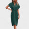 Elegantna midi haljina s profinjenim V-izrezom, blagim naborima u struku i diskretnim prorezom koji produžuje siluetu. Mekana, podatna tkanina lijepo pada i pruža udobnost kroz cijeli dan, dok čiste linije omogućuju lako stiliziranje – od poslovnih prilika do svečanih večeri.