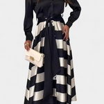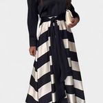 - Fluidna suknja s horizontalnim prugama koja stvara vizualnu dinamiku