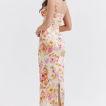Impozantna maksi haljina s cvjetnim uzorkom koja isijava ženstvenost i eleganciju. Njeno usko krojenje ističe siluetu, dok dekolte s tankim naramenicama pruža osjećaj suptilne privlačnosti. Komad koji kombinira romantiku i luksuz, idealan za posebne prigode.