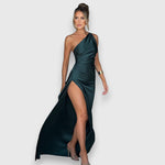 Asimetrična elegancija susreće blistavi glamur – Sienna očarava svojom sofisticiranom kroju s otkrivenim ramenom i fluidnom maxi dužinom. Sjajna tkanina daje haljini luksuznu auru, idealnu za posebne prigode.