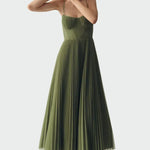 Elegantna i ženstvena haljina s tankim naramenicama i uskim korzetom koji ističe siluetu. Plisirana suknja midi dužine pruža jedinstveni pokret i bezvremensku eleganciju. Idealna za elegantne prigode, od vjenčanja do službenih događanja.