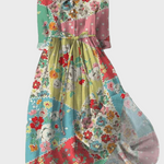 Ova impresivna duga haljina ističe se svojim razigranim patchwork uzorkom u živopisnim bojama, koje kombiniraju ružičastu, zelenu, plavu i žutu. Njezina jedinstvena cvjetna i točkasta šablona daje retro dojam i posebnu privlačnost, dok pojas u struku elegantno naglašava siluetu.