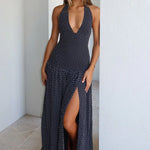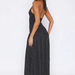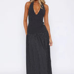 Ovo je haljina koju nikada nećete želeti da skinete. Sa dubokim halter izrezom, otvorenim leđima i prozračnim bočnim prorezom, kroj je smel, laskav i napravljen za sunce. Struk pada baš kako treba — elegantno, bez napora i stvoreno da se kreće s vama.