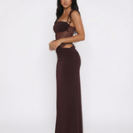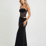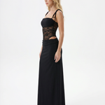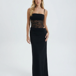Maxi haljina sa čipkastim panelom ima elegantan bandeau izrez, proziran čipkast korzet panel i fluidnu suknju do poda. Minimalna, senzualna i bez napora elegantna, napravljena je za večeri kada manje zaista znači više.