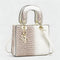 Sa sofisticiranim završetkom u životinjskoj teksturi i metalnim dijelovima visokog sjaja, ova torba je definicija profinjenosti. Strukturirana, s dvostrukim ručkama i dugom uklonjivom trakom, nudi svestranost koja odgovara od formalnih događaja do ležernih trenutaka sa stilom. Aksesor koji trenutno podiže svaku kombinaciju, donoseći šarm i autoritet.