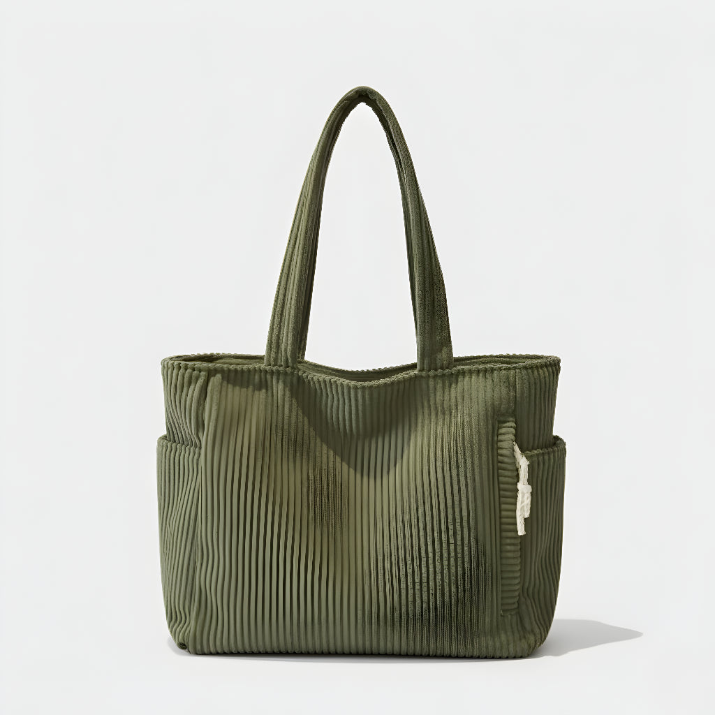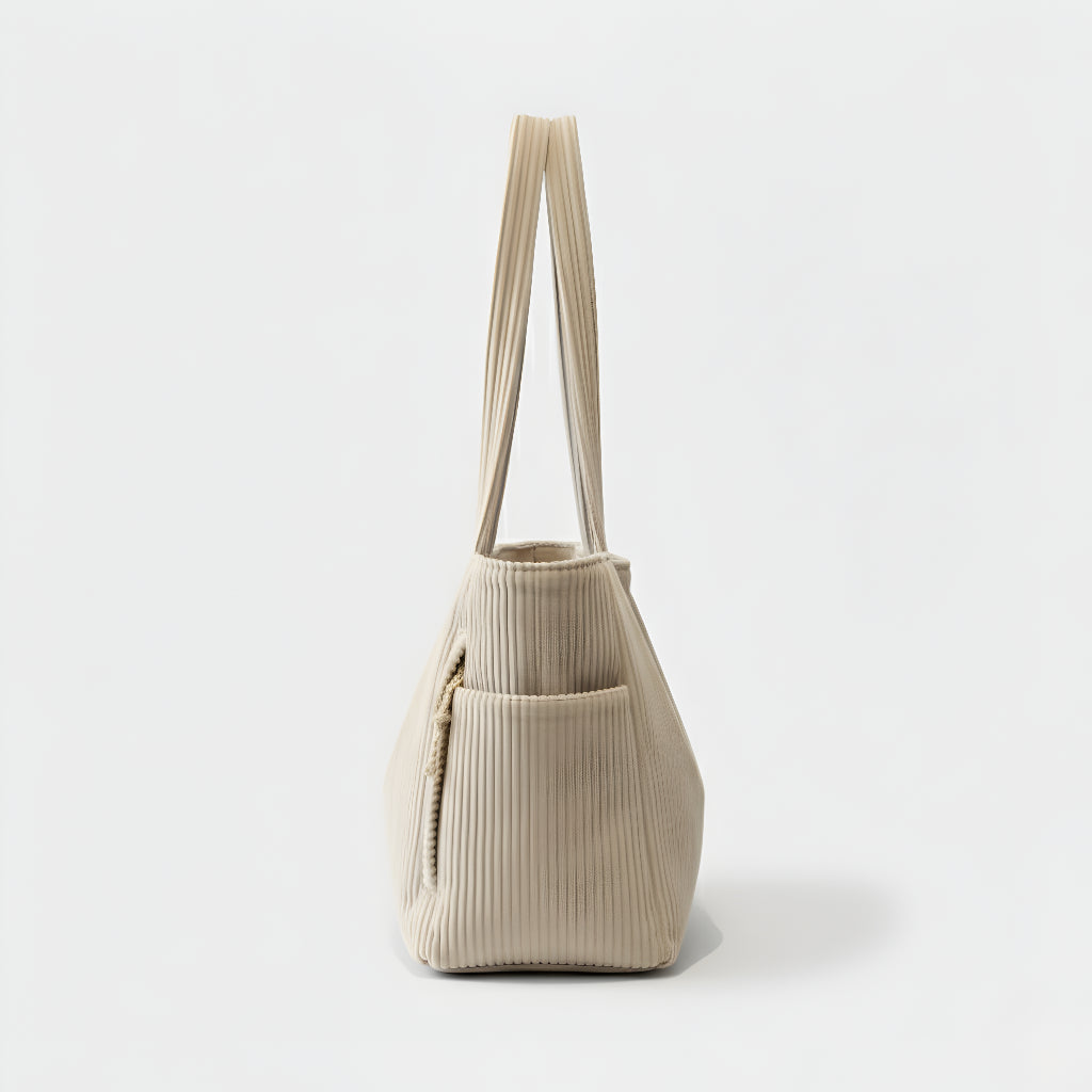 Ova torba kombinira moderan dizajn i funkcionalnost u jednom. Izrađena od mekanog, rebrastog materijala koji pruža ugodan osjećaj na dodir, savršena je za svakodnevnu upotrebu – bilo da idete na posao, fakultet ili opuštenu šetnju gradom. S prostranim unutarnjim dijelom i dodatnim bočnim džepom, vaše stvari uvijek će biti organizirane i lako dostupne.