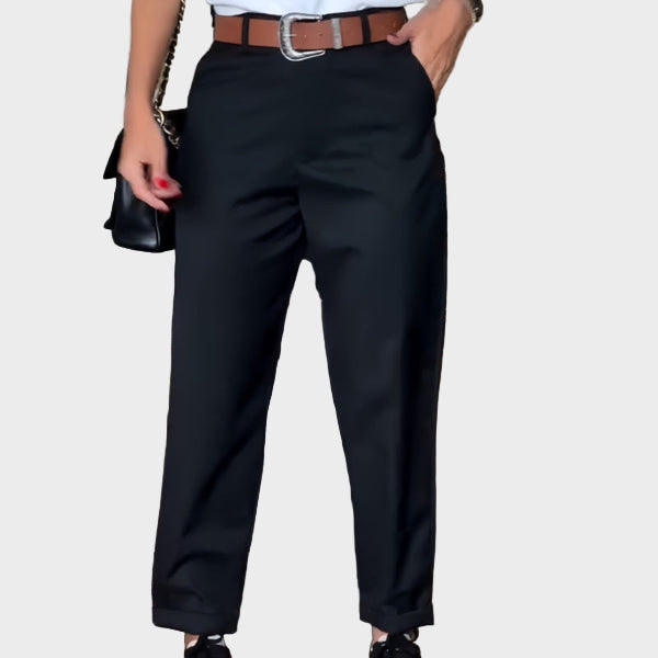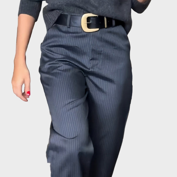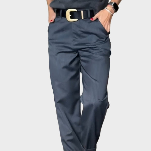 - Laskava silueta: Visoki struk definira figuru, dok ravni kroj vizualno izdužuje noge.
